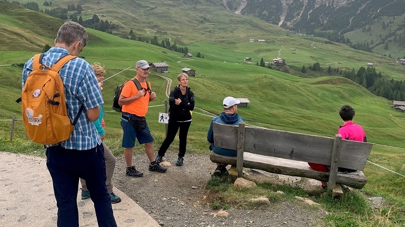 Nach der Bregenz-Reise der Langlaufgruppe der Lebenshilfe im April war am ersten September-Wochenende Wandern angesagt! Es ging auf die Seiser Alm zu der wunderschönen Saltnerhütte der Familie Karbon, die auch in Bregenz mit dabei war. Trotz der Schlechtwetter-Prognose fanden sich 28 Wander/innen und Radler/innen ein, um Thomas, Carmen, Lissy und Sepp zu besuchen. Nach einer ausgiebigen Wanderung über das Hochplateau mit einigen Auf- und Abstiegen und ständigem Blick auf den mächtigen Schlern erreichten wir nach eineinhalb Stunden unser Ziel. Thomas, Carmen und Lissy erwarteten uns bereits mit einem Aperitif und liebevoll hergerichteten Häppchen mit allem, was das Herz begehrt. Nach ausgiebigen Plaudereien gingen wir in die Stube, wo Carmen Gutes für jeden Gaumen zauberte. Die Nachspeise rundete ein Schnäpschen ab. Der Regen, der uns auf dem Rückweg zur Seiser-Alm-Bahn begleitete, konnte getreu unserem Motto „Geaht net gib’s net“ unserer guten Stimmung keinen Abbruch tun, Ein herzliches Dankeschön noch einmal an Carmen samt Team und an die Seiser-Alm-Bahn für die zur Verfügung gestellten Karten.